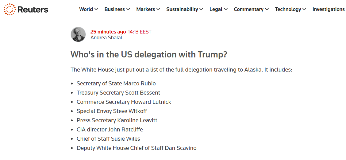 Вскоре после публикации агентства Пентагон сообщил, что министр обороны США Пит Хегсет тоже направляется в Анкоридж. Хотя его не называли среди участников американской делегации.