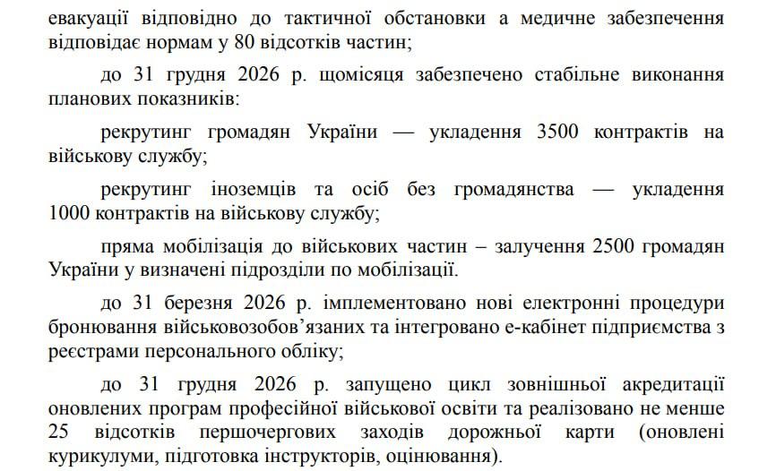В программе правительства заложено, что до 31 декабря 2026 года ежемесячно по программе рекрутинга подписывать контракты с ВСУ будут 3500 граждан Украины и 1000 иностранцев и лиц без гражданства. При этом принудительно мобилизовать каждый месяц будут 2500 граждан Украины.