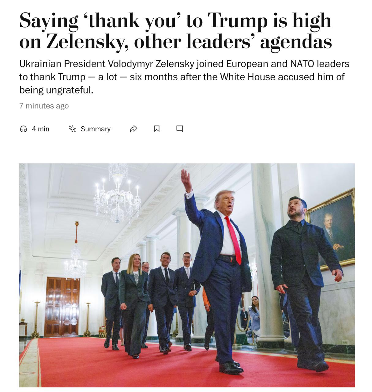 "Владимир Зеленский позаботился о том, чтобы выразить благодарность Президенту Дональду Трампу - и сделал это многократно. Зеленский поблагодарил Трампа за приём его и других мировых лидеров в Белом доме в понедельник с целью положить конец войне России против Украины. Он поблагодарил его за то, что тот представил его другим гостям и СМИ. Поблагодарил за "очень хороший разговор". И даже за то, что Трамп подарил ему карту его собственной страны", - говорится в статье.