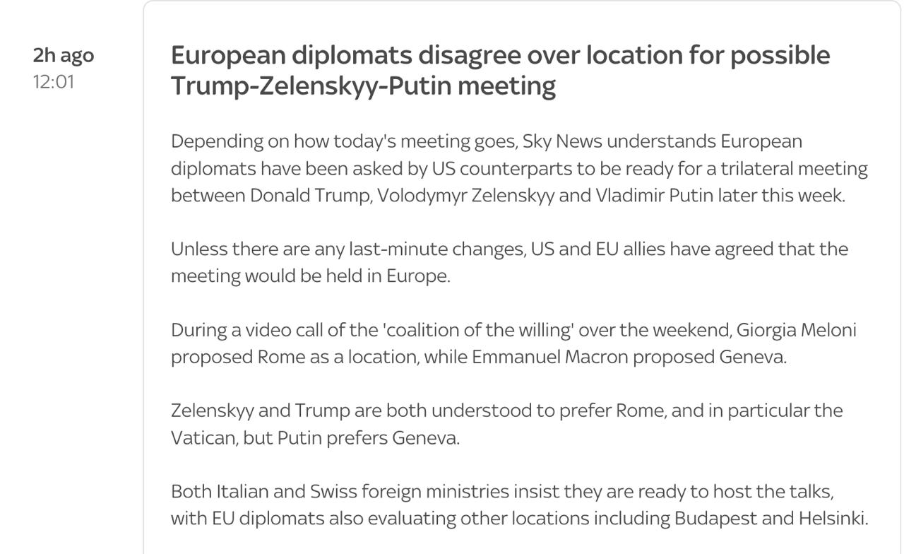 По данным издания, Путин готов встретиться в Женеве, которую предлагает Макрон. Зеленский и Трамп предпочитают Ватикан, а премьер-министр Италии Джорджия Мелони предложила Рим.