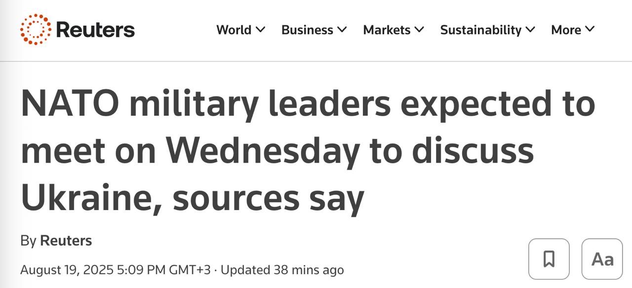 Завтра, 20 августа, военные лидеры НАТО обсудят ситуацию и дальнейшие действия по ситуации в Украине.