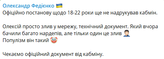 "Официально постановление о 18-22 годах еще не напечатал Кабмин. Алексей просто слил в сеть технический документ. Который вчера видели много нардепов, но только один это слил", - пишет Федиенко и призывает дождаться официального документа.