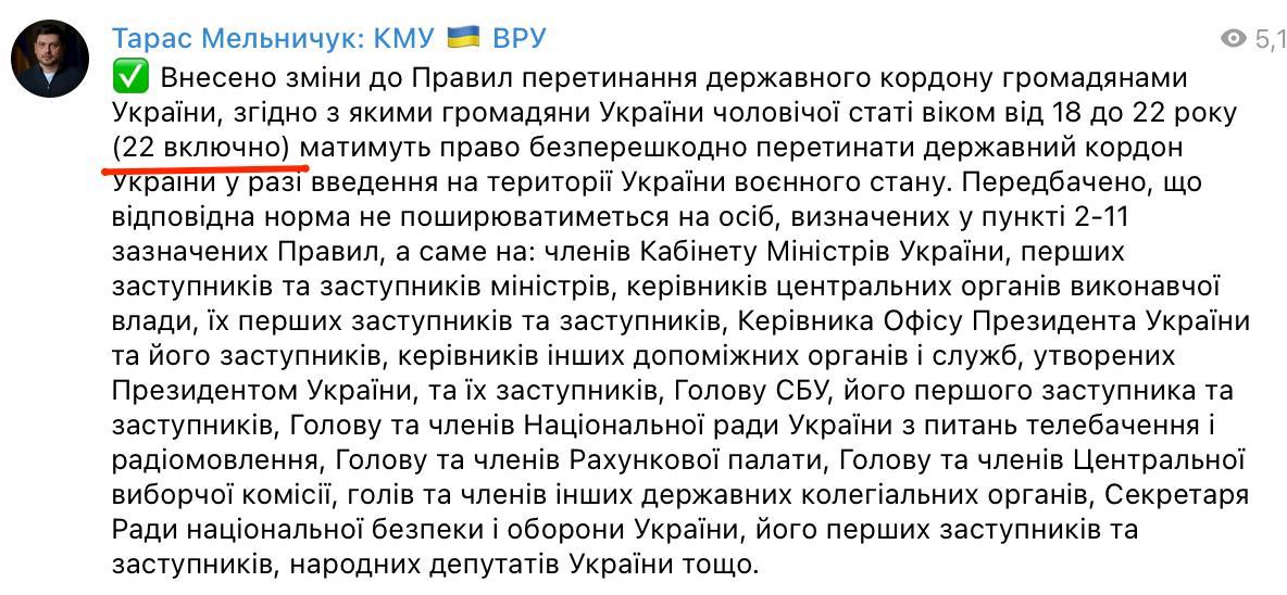 Хотя вчера представитель Кабмина в Раде Тарас Мельничук писал, что принято решение разрешить выезд за границу парням "до 22 лет включительно".