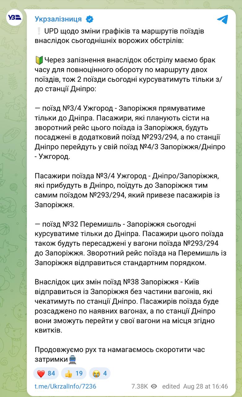17:00 Два поезда на Запорожье - из Ужгорода и Перемышля - сегодня будут курсировать только до Днепра и за ночной атаки, сообщает Укрзализныця.