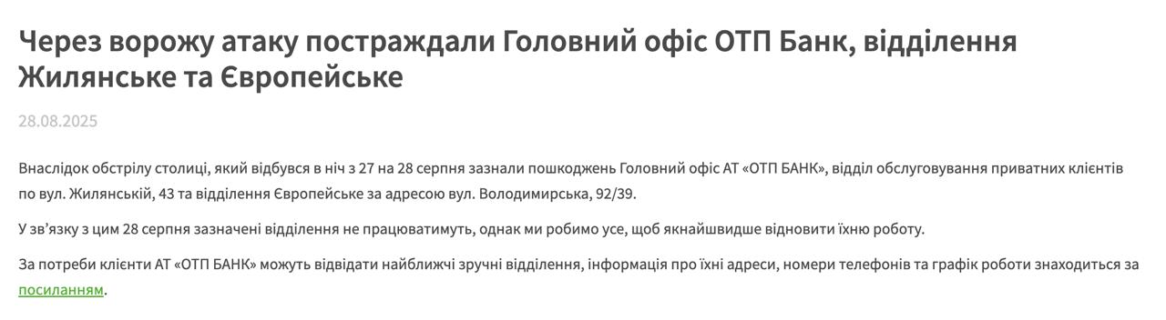 10:58 В районе Жилянской в центре Киева обстрелом повреждены офисы двух банков - Кредит Днепро и ОТП.