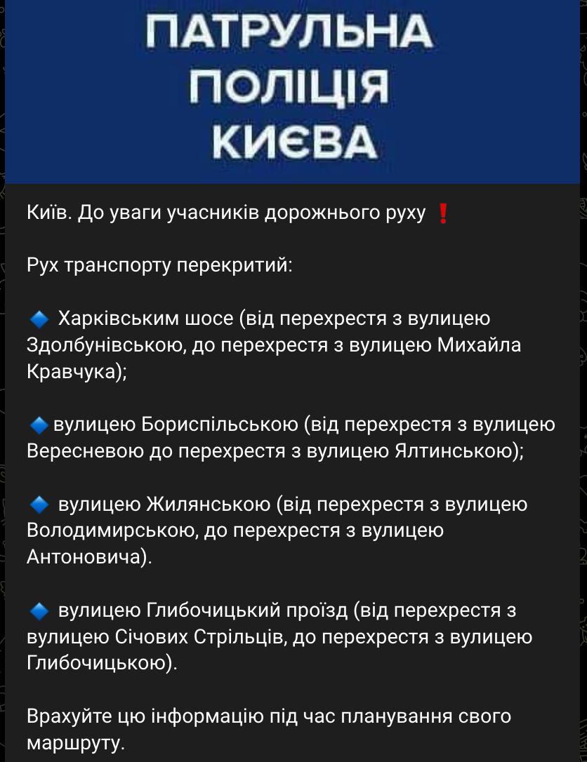 07:53 В Киеве перекрыли часть улиц после ночного массированного обстрела - как в центре, так и на левом берегу (район Харьковского шоссе и Бориспольской).