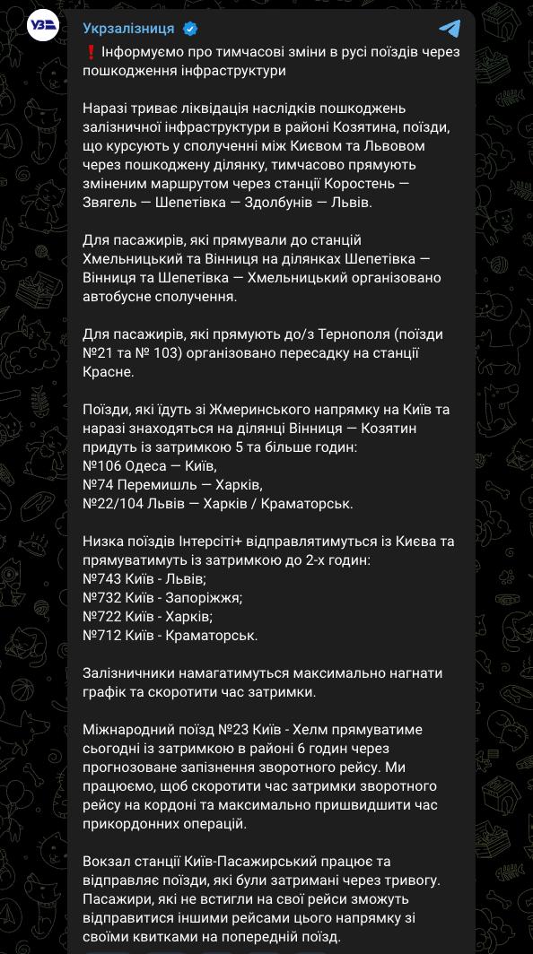 "Укрзализныця" подтвердила, что удар там был по железнодорожному узлу, и теперь меняется график следования поездов. Также пострадал парк поездов Интерсити+, один состав получил серьезные повреждения.