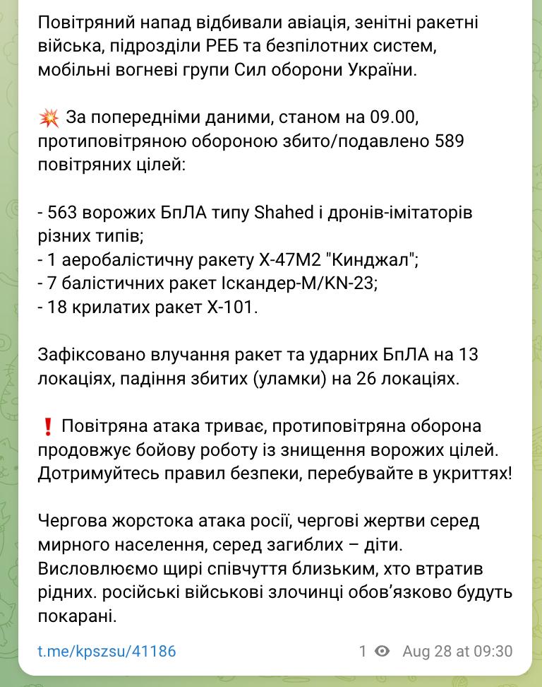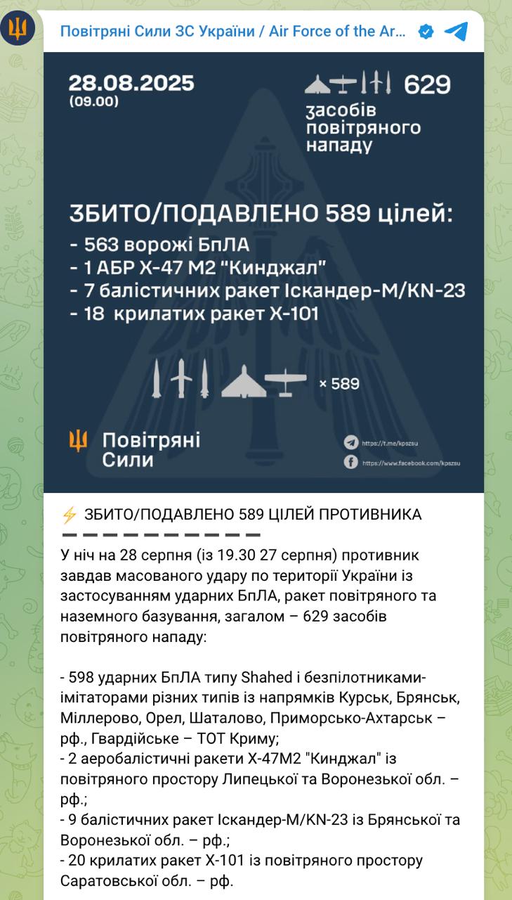 09:35 Украину ночью атаковали 598 БПЛА, включая "Шахеды", и 31 ракета. Были прилеты в 13 локациях.