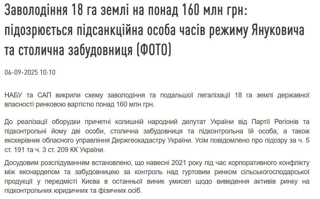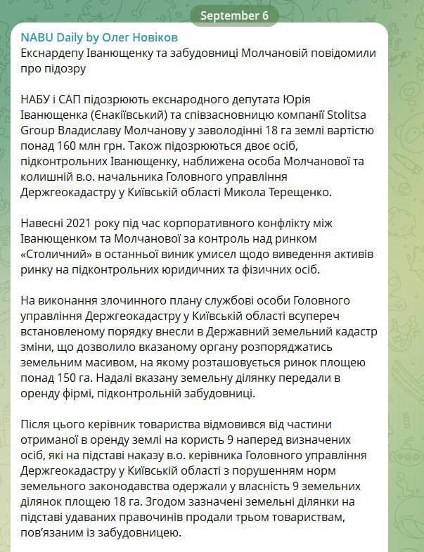 13.17 НАБУ выдвинула подозрение экс-нардепу Юрию Иванющенко и известной киевской бизнесвумен Владе Молчановой по обвинению в присвоении 18 гектар земли стоимостью более чем 160 млн гривен.
