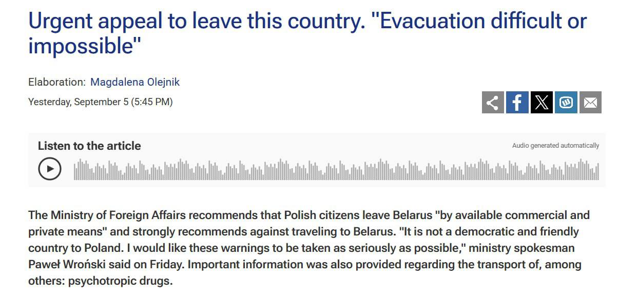 Соответствующее срочное обращение к своим гражданам, находящимся на территории Беларуси, выпустили в министерстве иностранных дел Польши.