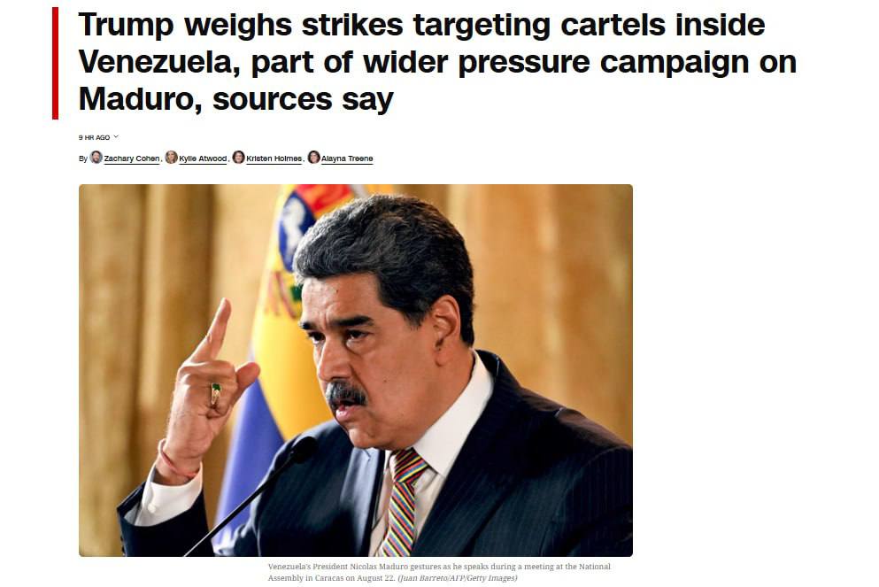 Конфликт между Венесуэлой и США продолжает накалятся. CNN со ссылкой на источники заявляет, что Дональд Трамп изучает возможности ударов в глубь Венесуэлы для борьбы с картелями, в качестве более глобальной стратегии ослабления режима Николаса Мадуро с конечной целью заставить его покинуть свой пост.