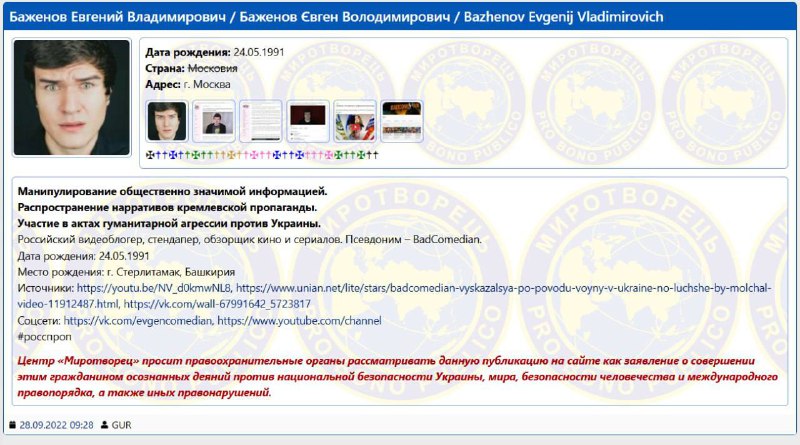 Российский киноблогер Евгений Баженов, более известный под псевдонимом BadComedian внесен в списки сайта "Миротворец".