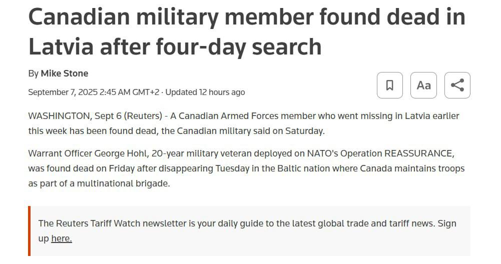 Уорент-офицер Вооруженных сил Канады Джордж Холл, находившийся в Латвии в рамках операции REASSURANCE по укреплению обороны НАТО, был найден мертвым в пятницу.
