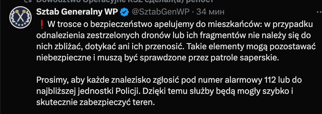 "Во время сегодняшней атаки Российской Федерации, наносящей удары по объектам, находящимся на территории Украины, наше воздушное пространство неоднократно нарушалось объектами типа дрон. Ведётся операция, целью которой является идентификация и нейтрализация этих объектов. По приказу Оперативного командующего ВС Польши было применено вооружение, а службы проводят мероприятия по обнаружению сбитых аппаратов.