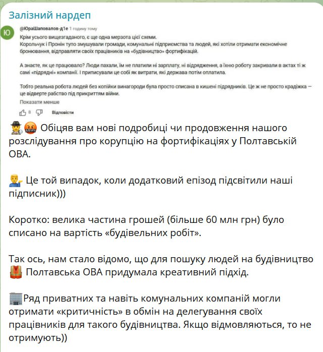 "Для поиска людей на строительство Полтавская ОВА придумала креативный подход. Ряд частных и даже коммунальных компаний могли получить критичность в обмен на делегирование своих работников для такого строительства. Если отказываются, то не получают. В чем схема? Ну потому что деньги на работы – более 60 млн грн – списывались на совсем других людей”, – рассказал Железняк.
