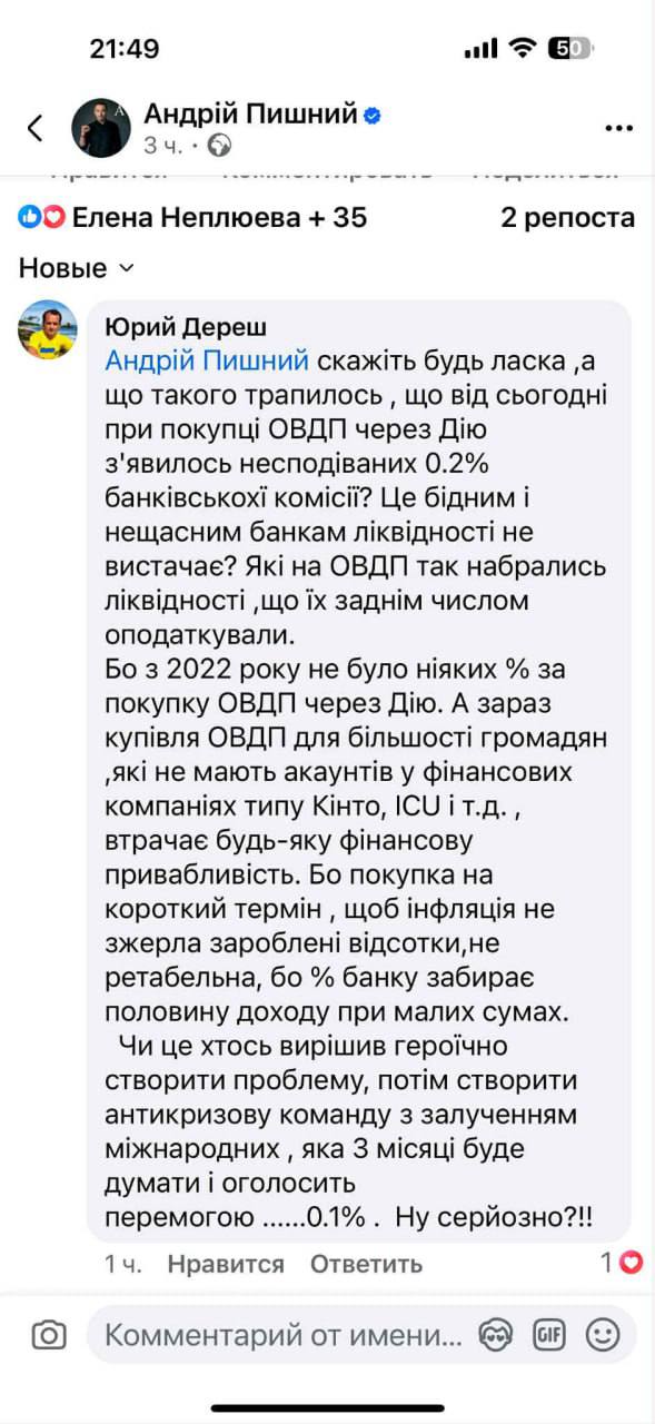 "Что такого случилось, что при покупке ОВГЗ через "Дию" проявились неожиданные 0,2% банковской комиссии? Это бедным и несчастным банкам ликвидности не хватает?" - спросил пользователь Юрий Дереш.