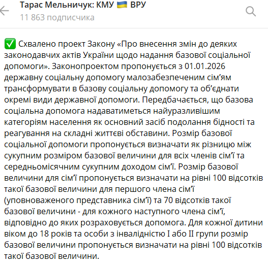 Кабинет министров Украины хочет ввести с 1 января 2026 года вместо различных социальных выплат единую базовую соцпомощь.
