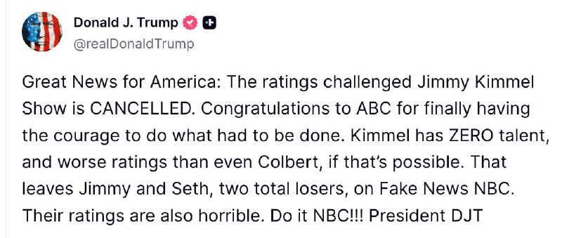 "Поздравляю ABC с тем, что наконец-то набрались смелости сделать то, что должно было быть сделано. У Киммела НОЛЬ таланта, и рейтинги хуже, чем у Кольбера (уволенный ранее с телеканала CBS комик Стивен Кольбер, тоже яростный критик Трампа - Ред.), если это возможно. Таким образом, остаются Джимми и Сет (ведущие "Ночного шоу с Джимми Фэллоном" и "Поздняя ночь с Сетом Майерсом" - Ред.), двое полных неудачников, на фейковых новостях NBC. Их рейтинги также ужасны. Сделай это NBC!" - призвал президент США в своих соцсетях.