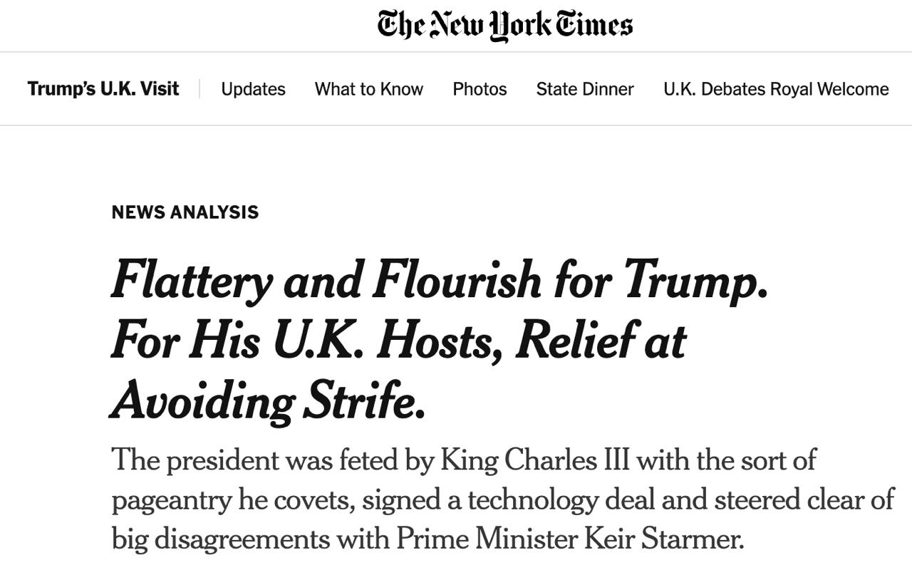 "Трамп, похоже, не смягчил условия торговой сделки, которую Великобритания заключила с Соединенными Штатами. Он также не пообещал оказать какое-либо новое давление по двум вопросам безопасности, которые больше всего беспокоят Великобританию: войне России с Украиной и изнурительной военной кампании Израиля в Газе", - пишет NYT.