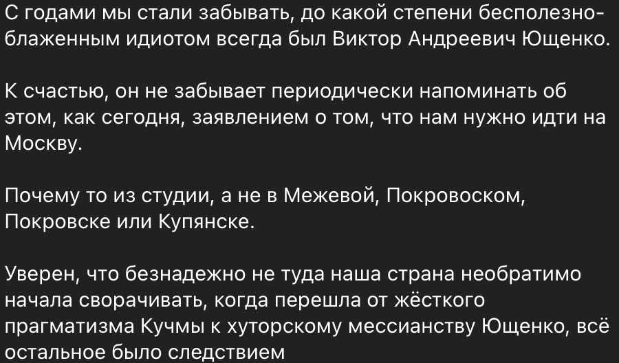 "С годами мы стали забывать, до какой степени бесполезно-блаженным идиотом всегда был Виктор Андреевич Ющенко. К счастью, он не забывает периодически напоминать об этом, как сегодня, заявлением о том, что нам нужно идти на Москву. Почему то из студии, а не в Межевой, Покровоском, Покровске или Купянске. Уверен, что безнадежно не туда наша страна необратимо начала сворачивать, когда перешла от жёсткого прагматизма Кучмы к хуторскому мессианству Ющенко, всё остальное было следствием", - написал Бужанский в своем Telegram-канале.