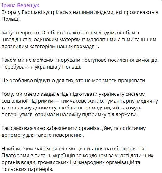 "Также мы не можем игнорировать постепенное усиление требований к пребыванию украинцев в Польше. Это особенно ощутимо для тех, кто не имеет возможности работать. Поэтому мы должны заранее подготовить украинскую систему социальной поддержки", - отметила она.