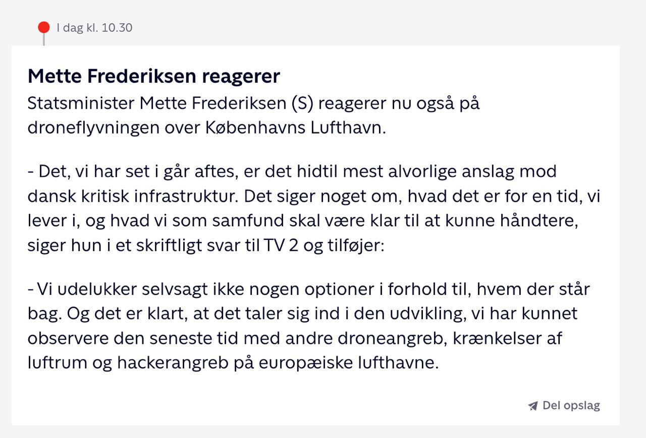 Между тем власти Дании пока не знают, чьи дроны к ним залетели, но подозревают в их запуске Россию. Премьер-министр страны Метте Фредериксен на вопрос журналистов TV2, подозревает ли она в причастности к полету БпЛА Москву, ответила: "В любом случае я никоим образом не могу отрицать, что это Россия".