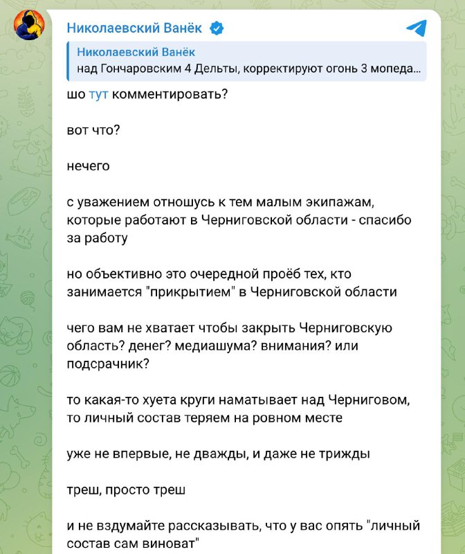 "Объективно это очередной про@б тех, кто занимается прикрытием в Черниговской области. Чего вам не хватает, чтобы закрыть Черниговскую область? Денег? Медиашума? Внимания? Или подсрачник? То какая-то ху@та круги наматывает над Черниговом, то личный состав теряем на ровном месте. Уже не впервые, не дважды, и даже не трижды. Треш, просто треш. И не вздумайте рассказывать, что у вас опять "личный состав сам виноват", - пишет телеграм-канал.