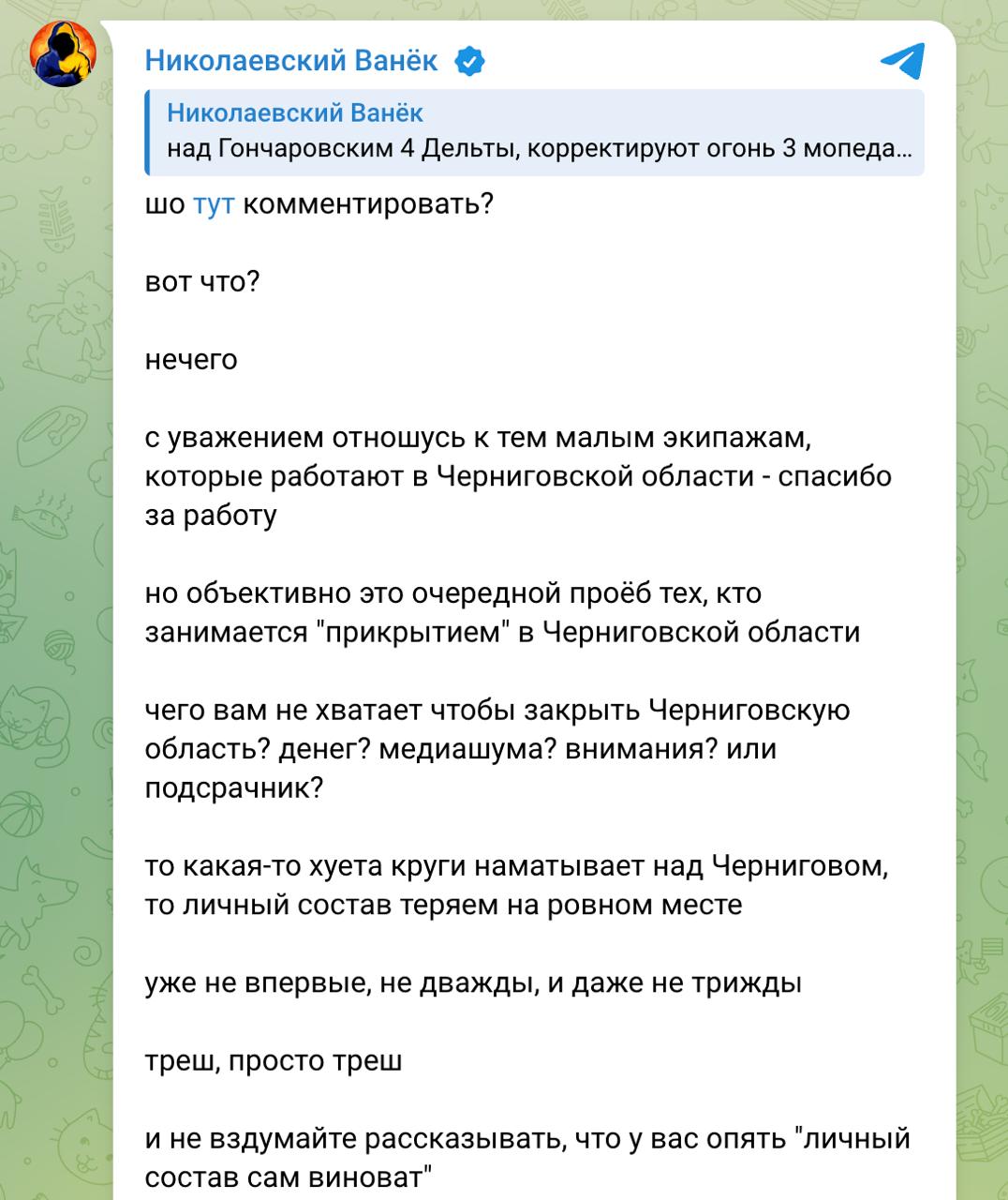 "Объективно это очередной про@б тех, кто занимается "прикрытием" в Черниговской области. Чего вам не хватает, чтобы закрыть Черниговскую область? Денег? Медиашума? Внимания? Или подсрачник? То какая-то ху@та круги наматывает над Черниговом, то личный состав теряем на ровном месте. Уже не впервые, не дважды, и даже не трижды. Треш, просто треш. И не вздумайте рассказывать, что у вас опять "личный состав сам виноват", - пишет паблик.