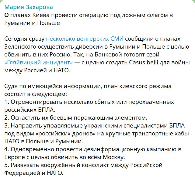 - Направить управляемые украинскими специалистами БпЛА под видом "российских дронов" на крупные транспортные хабы НАТО в Польше и Румынии.