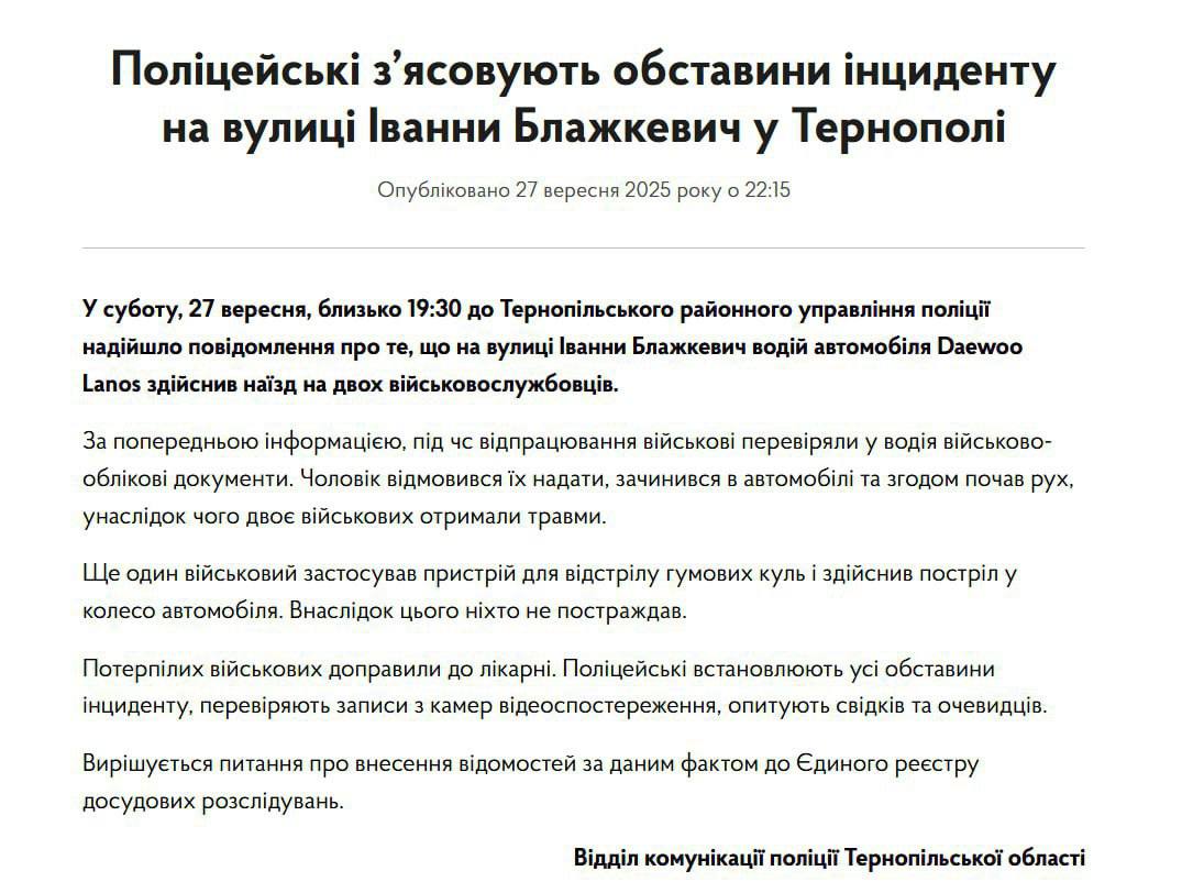 По информации правоохранителей, 27 сентября, примерно в 19:30, в Тернопольское районное управление полиции поступило сообщение о наезде на военнослужащих на улице Иванны Блажкевич.