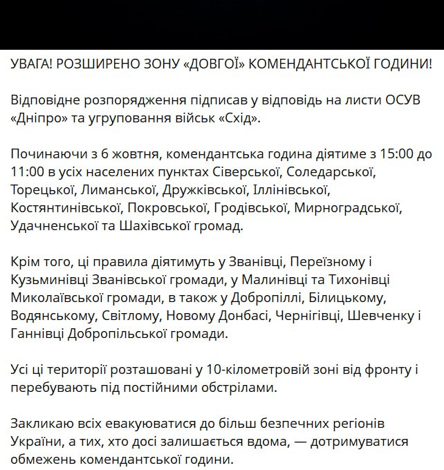 "Начиная с 6 октября, комендантский час будет действовать с 15:00 до 11:00 во всех населенных пунктах Северской, Соледарской, Торецкой, Лиманской, Дружковской, Ильиновской, Константиновской, Покровской, Гродовской, Мирноградской, Удачненской и Шаховской общин", – написал Филашкин.
