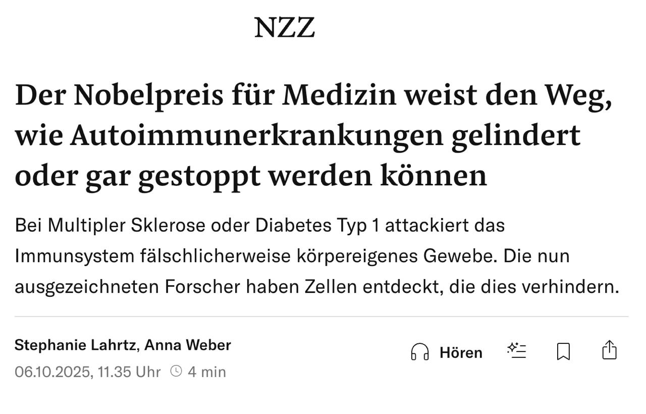 Открытие нобелевских лауреатов по медицине в этом году откроет путь к лечению склероза и диабета - NZZ