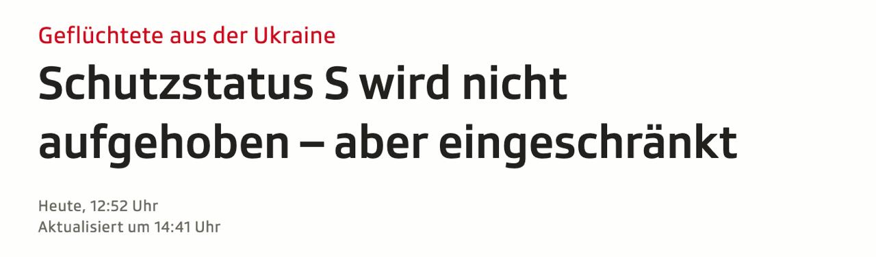Федеральный совет (правительство) Швейцарии также решил не отменять действие статуса защиты S до 4 марта 2027 года. Однако швейцарские власти оставляют за собой право пересмотреть решение, если ситуация в Украине стабилизируется.
