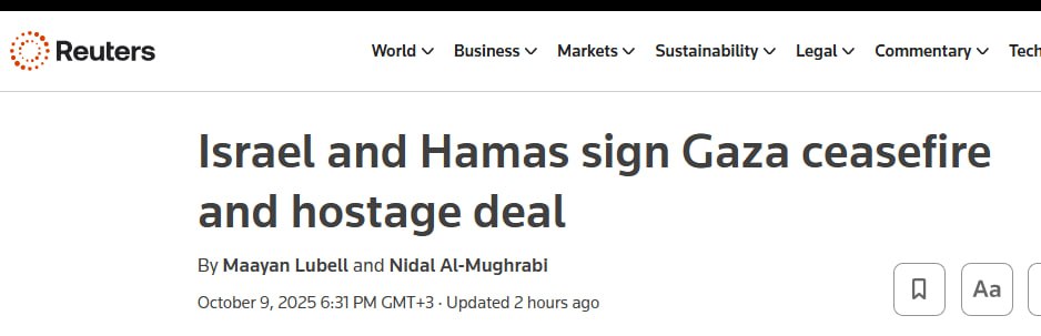В свою очередь о том, что Израиль и ХАМАС подписали соглашение о прекращении огня и освобождении заложников в секторе Газа, сообщает агентство Reuters.
