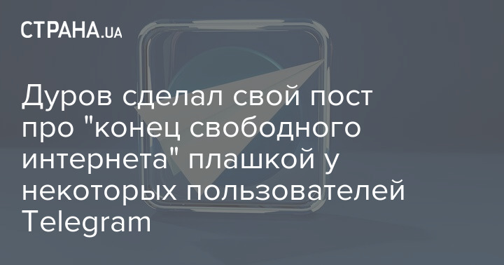 Основатель социальной сети Telegram Павел Дуров поставил свой пост про "конец свободного интернета" плашкой у некоторых пользователей приложения.