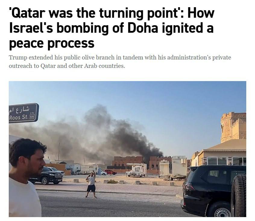 "Президент США стал гораздо более резким и прямолинейным, и после удара в Дохе необходимость мирного соглашения стала ещё более неотложной. Это позволило президенту оказать максимальное давление на Израиль, что он и сделал. И это действительно вынудило Израиль согласиться на мир", - заявил изданию высокопоставленный представитель Белого дома.