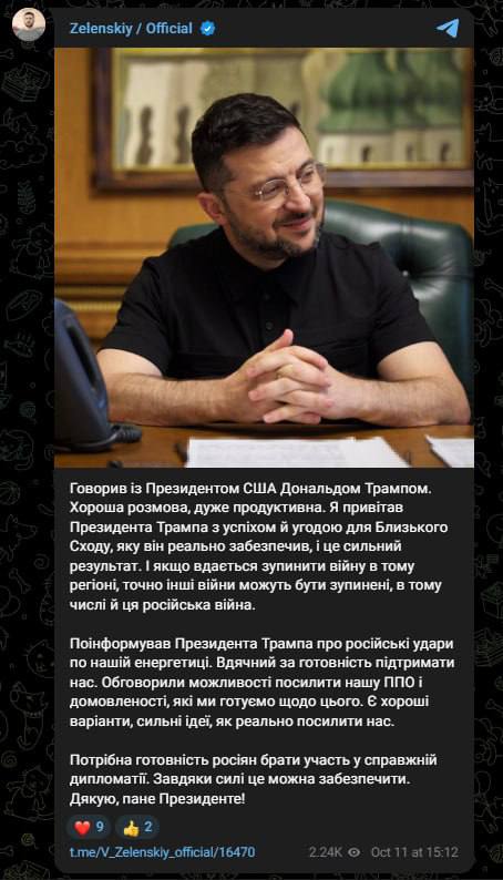 Зеленский сообщил, что поздравил Трампа с успехом и соглашением для Ближнего Востока, которое он действительно обеспечил, и выразил уверенность, что президент США сможет остановить и другие войны, в том числе в Украине.