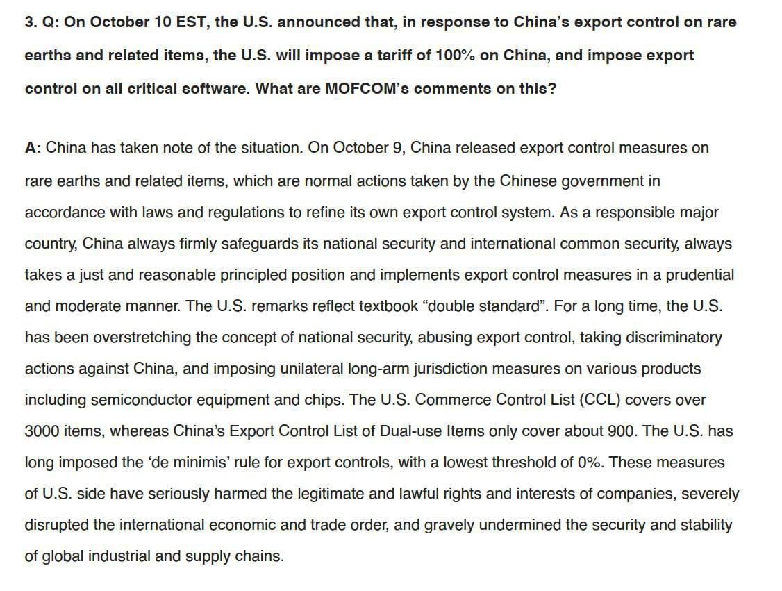 "США долгое время расширяли понятие национальной безопасности, злоупотребляли экспортным контролем, принимали дискриминационные меры против Китая и вводили односторонние меры юрисдикции «длинной руки» в отношении различных товаров, включая полупроводниковое оборудование и микросхемы", - говорится в заявлении.