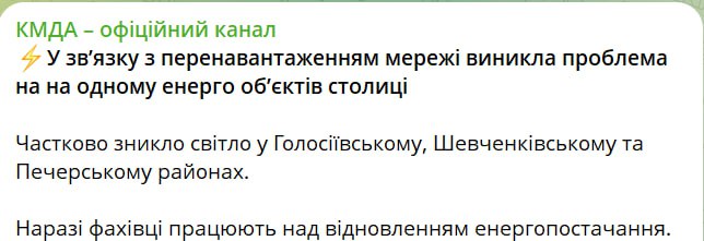 Частично исчез свет в Голосеевском, Шевченковском и Печерском районах, говорится в сообщении КГГА в телеграм-канале.