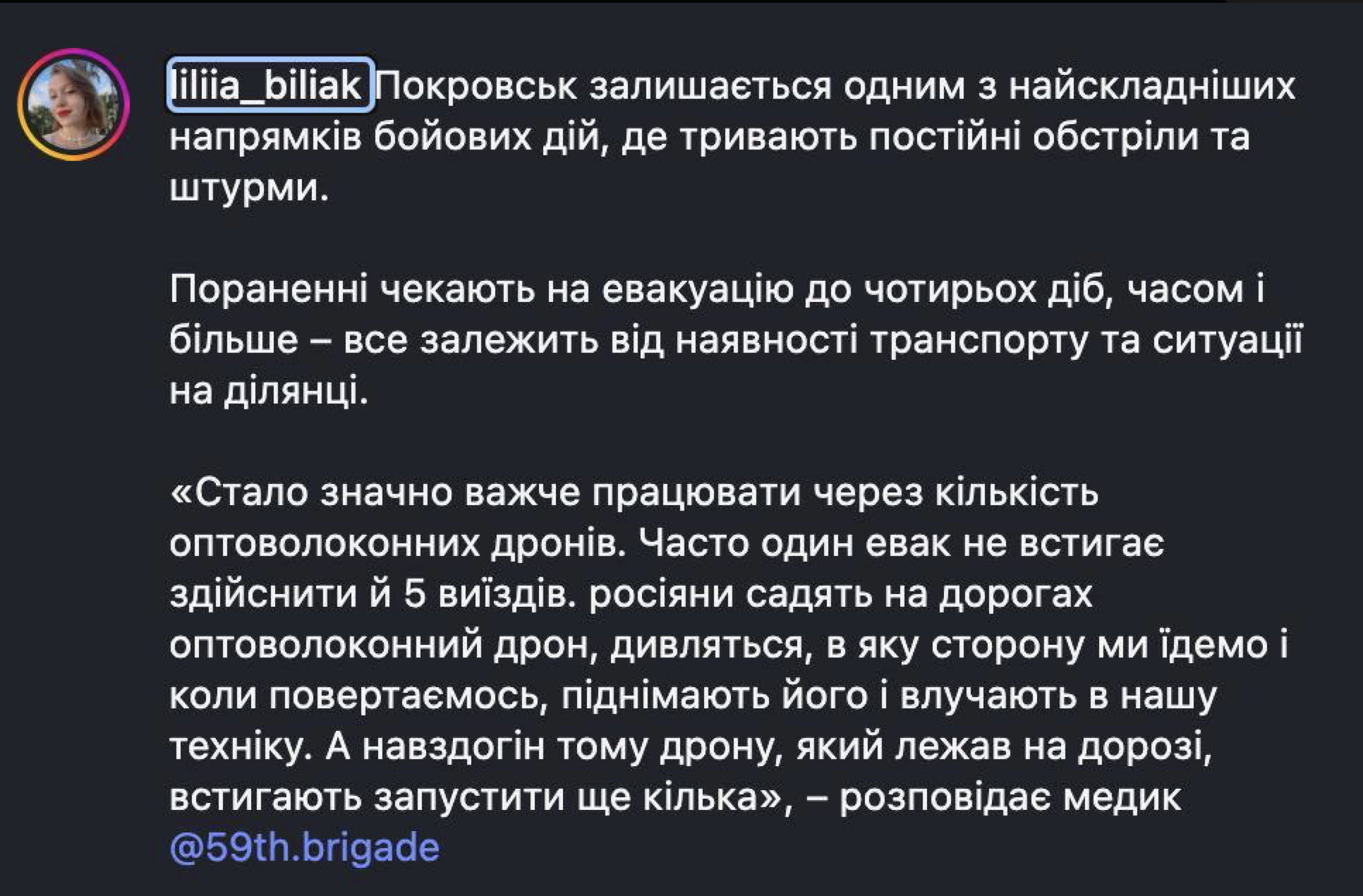 "Из-за отсутствия бронированного транспорта, защищённого антидроновыми конструкциями или хотя бы средствами РЭБ, эвакуация на Покровском направлении почти невозможна. Более того, нередко в подразделениях эвакуационный транспорт отсутствует вовсе", - добавляет волонтер.