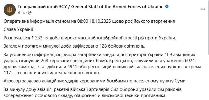 Война в Украине идет 1333-й день. Мы следим за последними новостями субботы, 18 октября 2025 года, в обновляемом онлайне