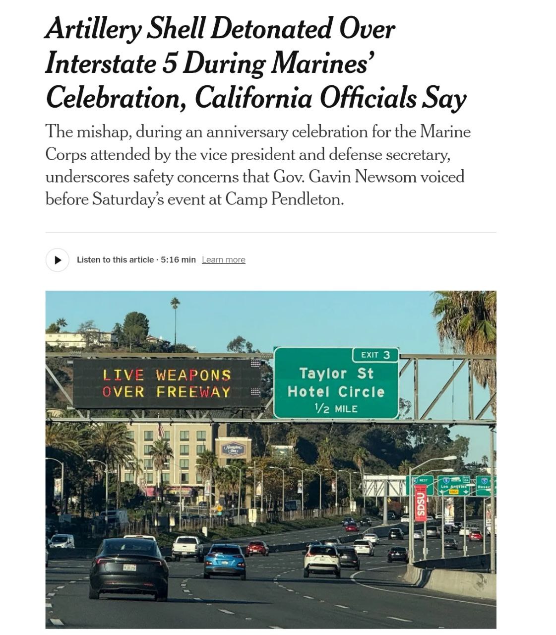 Заявляется, что 155-миллиметровый артиллерийский снаряд взорвался во время показательной стрельбы в Калифорнии, приуроченной к 250-летию корпуса морской пехоты, куда приехал вице-президент США.