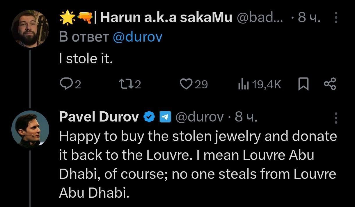 "Рад купить украденные украшения и пожертвовать их обратно Лувру. Я имею в виду, конечно, Лувр в Абу-Даби; никто ведь не крадёт из Лувра в Абу-Даби", - написал Дуров.