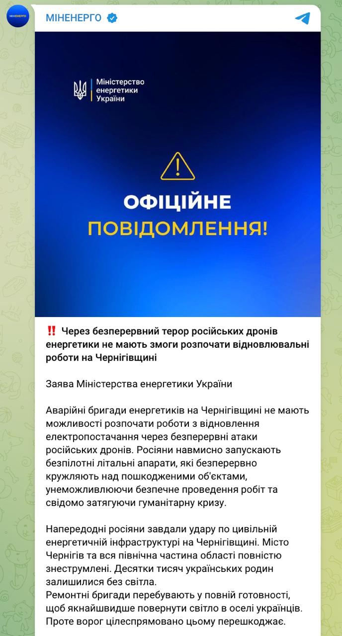 Тем временем в Минэнерго заявляют, что блэкаут в Чернигове и области затягивается из-за того, что российские дроны мешают проведению ремонтных работ.