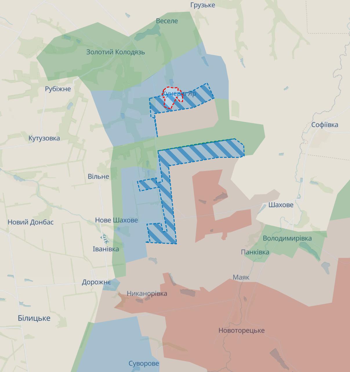 По данным ресурса, ВСУ восстановили контроль над населенными пунктами Кучеров Яр, Сухецкое и Затишок, а также отбросили противника вблизи Никаноровки, Нового Шахового и Фёдоровки.