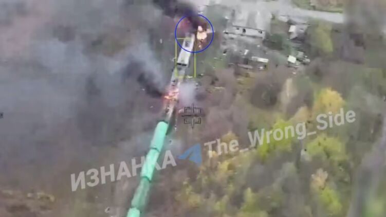 Как утверждается в публикациях, на видео запечатлена атака "шахедов" по составу с топливом в районе села Черноплатово Сумской области.