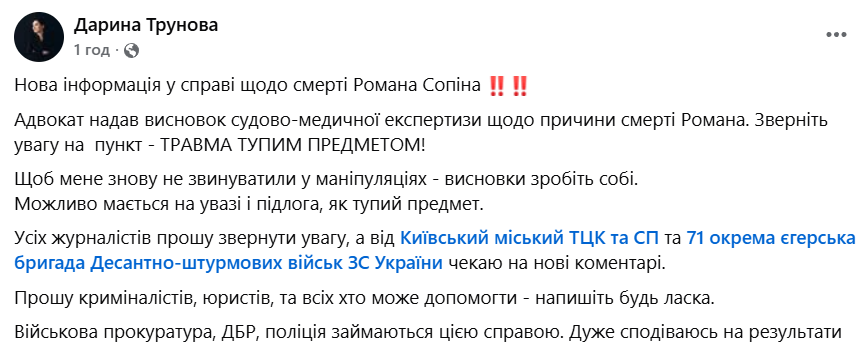 "Новая информация по делу о смерти Романа Сопина. Адвокат предоставил заключение судебно-медицинской экспертизы о причине смерти Романа. Обратите внимание на пункт "травма тупым предметом"!" - говорится в заявлении журналистки.
