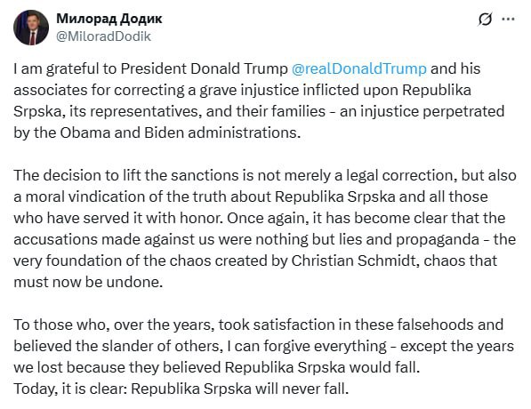 "Я благодарен президенту Дональду Трампу и его соратникам за исправление тяжёлой несправедливости, нанесённой Республике Сербской, её представителям и их семьям – несправедливости, совершённой администрациями Обамы и Байдена. Решение о снятии санкций – это не просто юридическая корректировка, но и моральное подтверждение правды о Республике Сербской и всех тех, кто служил ей с честью. Снова стало ясно, что обвинения, выдвинутые против нас, были лишь ложью и пропагандой... Тем, кто на протяжении многих лет удовлетворялся этими ложными сведениями и верил клевете других, я могу простить всё – кроме утраченных лет, потому что они считали, что Республика Сербская падёт. Сегодня ясно: Республика Сербская никогда не падёт", – заявил Додик.