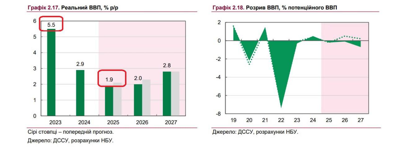 В связи с этим НБУ ухудшил свой прогноз по росту экономики Украины в 2025 году с 2,1% до 1,9%. Для сравнения: по итогам 2024 года увеличение ВВП было зафиксировано на уровне 2,9%, 2023-го — на 5,5%.