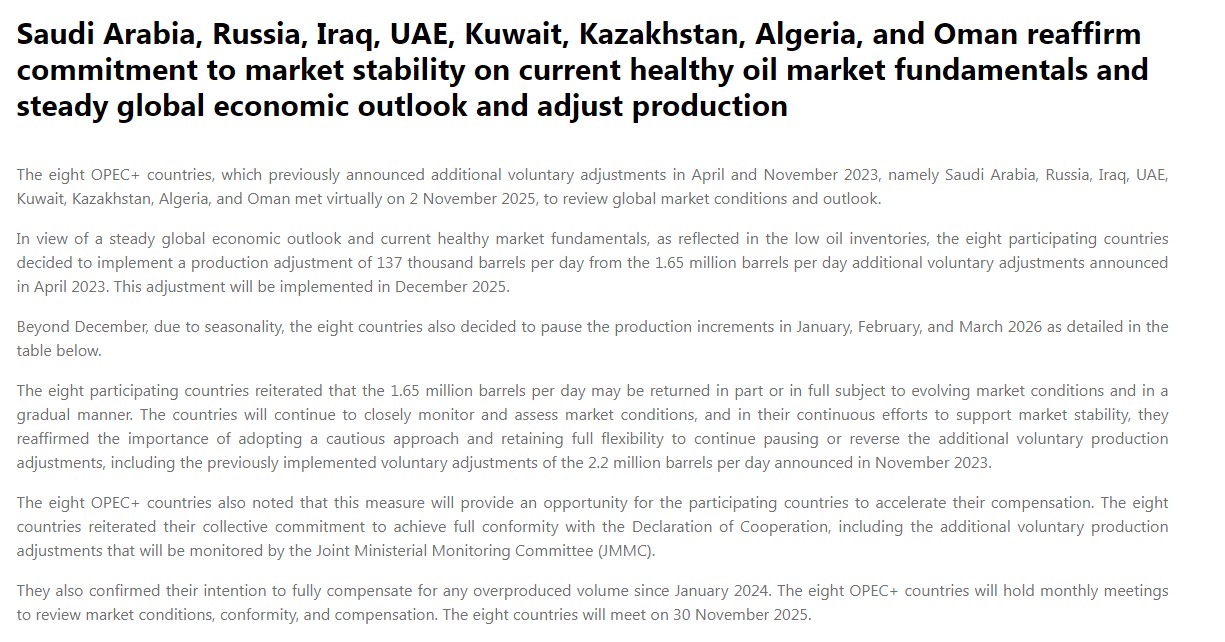 "Саудовская Аравия, Россия, Ирак, ОАЭ, Кувейт, Казахстан, Алжир и Оман провели виртуальную встречу 2 ноября для анализа состояния и перспектив мирового рынка. В связи со стабильными перспективами мировой экономики и текущими благоприятными фундаментальными факторами рынка, о чем свидетельствуют низкие запасы нефти, восемь стран-участниц приняли решение о корректировке добычи на 137 тысяч баррелей в сутки по сравнению с 1,65 миллиона баррелей в сутки, объявленными в апреле 2023 года. Эта корректировка будет реализована в декабре 2025 года. После декабря в связи с сезонностью восемь стран также решили приостановить увеличение производства в январе, феврале и марте 2026 года", - говорится в пресс-релизе.